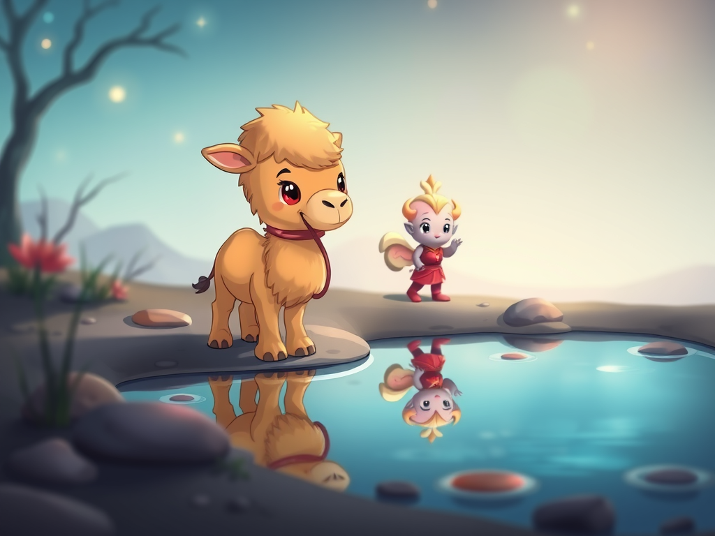 The Djinn sat down, with his chin in his hand, and began to think a Great Magic, while the Camel looked at his own reflection in the pool of water.