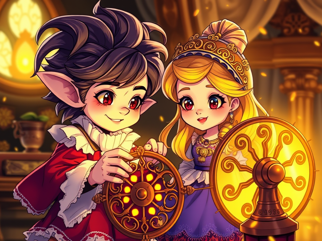 The little man took the necklace, seated himself in front of the wheel, and “whirr, whirr, whirr,” three turns, and the reel was full; then he put another on, and whirr, whirr, whirr, three times round, and the second was full too. And so it went on until the morning, when all the straw was spun, and all the reels were full of gold.